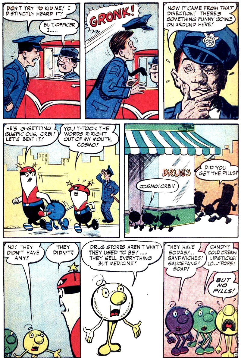 Put on your vinyl of Dark Side Of the Moon by Pink Floyd (and perhaps in this context, that band's name sounds dirty, too), while you read of Cosmo and Orbi's adventures with their little ball-sac buddies, the Oog (spelled backwards is goo, heh-heh), and the Monster Of the Dark Side, the Gillywump. This is from Archie Comics' Cosmo the Merry Martian #2, from 1959, drawn (and perhaps also written) by Bob White.